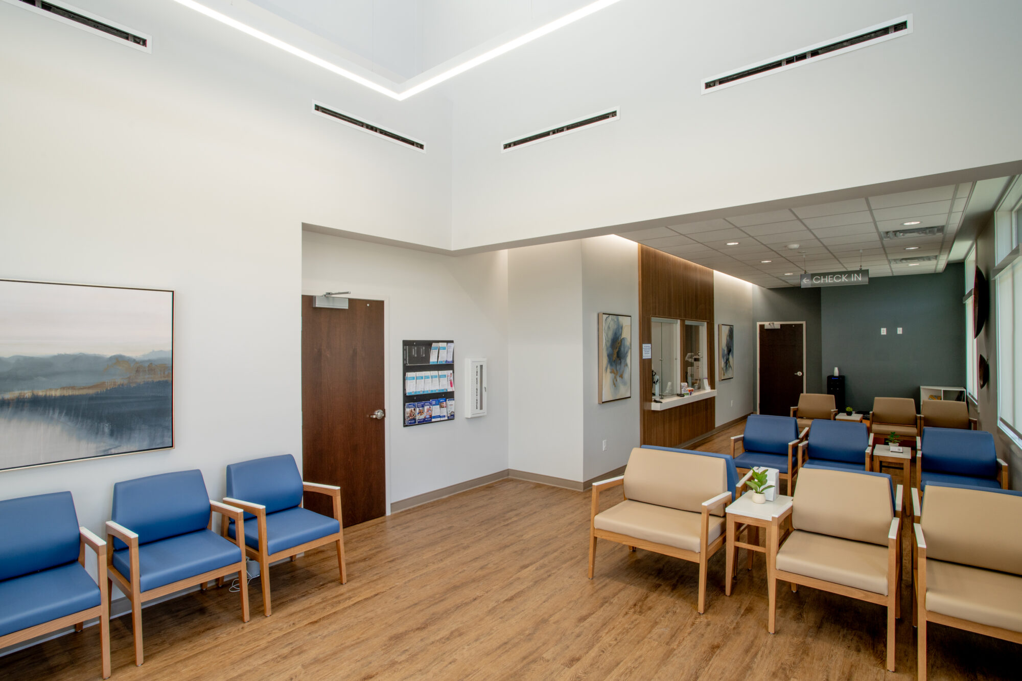 The facility is designed with both efficiency and patient comfort in mind. A centrally located clinical care team work area seamlessly integrates into the clinical space, encouraging streamlined workflows, reducing staff foot traffic, and improving the speed and effectiveness of delivered care. Also implemented into the design is a carefully crafted standardized exam room configuration, intended for quick and intuitive room recognition among staff, in effort to improve efficiency and reduce human error.